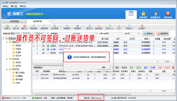 在商貿(mào)流通領(lǐng)域,送貨單作為貨物交接的核心憑證,其簽收與回執(zhí)流程直接影響企業(yè)資金流轉(zhuǎn)效率與風險管控能力。信管飛送貨單軟件以智能化流程管理為核心,通過“待簽回-已簽回-已結(jié)賬”三階狀態(tài)控制,實現(xiàn)貨物交付全鏈路可視化追蹤,更以精細化權(quán)限管理功能,為企業(yè)筑牢運營安全防線。 針對多角色協(xié)作場景,信管飛送貨單軟件創(chuàng)新推出操作權(quán)限分級機制