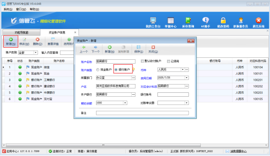 許多用戶在使用軟件記賬時都會問到一個問題:如何新增現(xiàn)金賬戶和銀行賬戶?本節(jié)我們以信管飛RMS專業(yè)版來介紹一下進(jìn)銷存軟件內(nèi)如何新增資金賬戶? 在功能導(dǎo)航窗點擊“基礎(chǔ)資料”—“資金賬戶”打開資金賬戶信息界面,點擊工具欄中的“新增”按鈕,在彈出的“資金賬戶—新增”窗口錄入賬戶名稱、勾選賬戶類型“現(xiàn)金賬戶”、