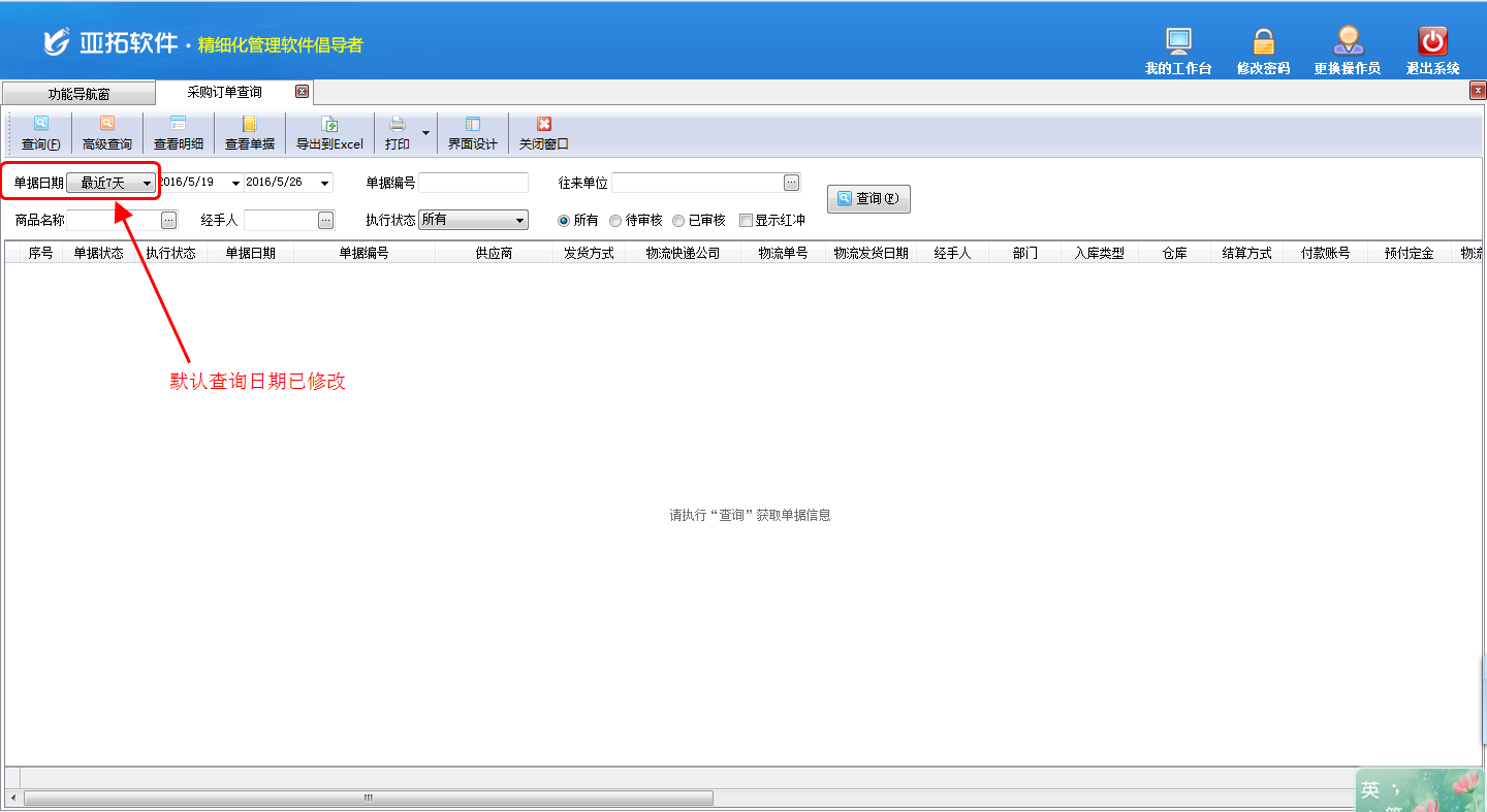 亞拓管理軟件(精細化管理軟件、進銷存管理軟件、記賬軟件)及紅管家倉庫管理軟件內都包含了統計查詢功能(采購單匯總表、銷售單匯總表、銷售單明細查詢、銷售毛利匯總等統計查詢報表),軟件內統計查詢功能默認的查詢日期為“最近3個月”(如下圖一所示),但是如果需要修改默認查詢日期,該如何修改呢?下面我們以亞拓管理軟件專業版為例詳細介紹下軟件內如何修改默認查詢日期。圖一&nb