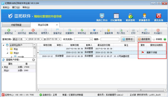 紅管家出納記賬軟件標(biāo)準(zhǔn)版、專業(yè)版中可對已開出的憑證進(jìn)行復(fù)核駁回操作,對于有問題的憑證可標(biāo)記駁回原因,可對原因進(jìn)行分類以不同的顏色標(biāo)記。 以出納記賬軟件專業(yè)版的現(xiàn)金日記賬為例,如何標(biāo)記駁回原因。打開左側(cè)導(dǎo)航窗的“出納管理”,選擇“現(xiàn)金日記賬”中一個憑證(只有待審核的憑證才能被標(biāo)記),點(diǎn)擊工具欄中的“更多