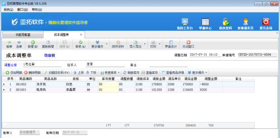 亞拓管理軟件(進銷存軟件)支持負庫存開單,如果商品不存在成本價會提示錄入成本價,實際工作中有可能會出現錄錯成本價的情況,導致最終在倉庫庫存查詢中發現商品成本價異常。另外,在業務經營中有時也需要進行優惠性調價(節日或促銷活動調價)、季節性商品調價、政策性商品調價等,這些業務都可以通過“成本調整單”進行價格調整。亞拓管理軟件標準版和專業版都包括成本調整單,我們以亞
