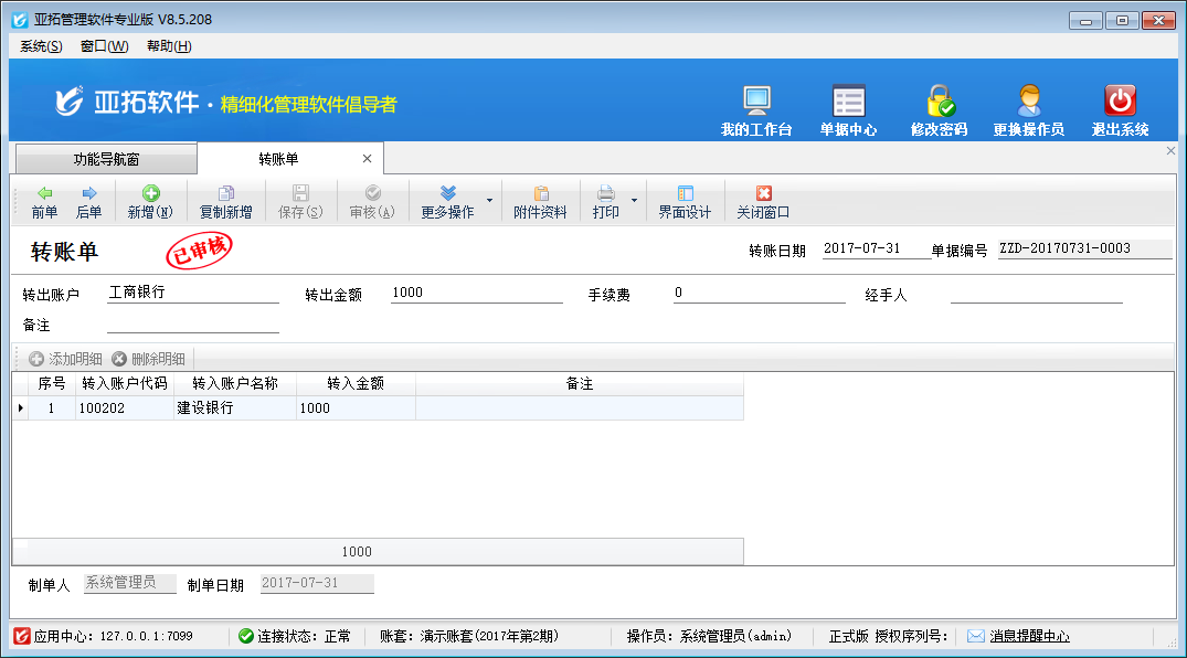 亞拓管理軟件專業版內包含有財務處理模塊,其中轉賬單主要用于實現不同資金賬戶之間的資金劃撥,轉賬單不影響總的資產總額(有轉賬手續費的除外),本篇文章我們來介紹一下轉賬單的使用方法。 在功能導航窗點擊“財務處理”—“轉賬單”,系統可以打開轉賬單界面,如下圖所示。 在單據主體內輸入“轉出賬戶”以