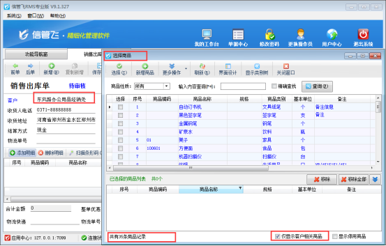信管飛RMS軟件、信管飛倉庫管理軟件和信管飛送貨單軟件開單時都支持選擇系統內已錄入的商品信息,進行快速選擇商品來開單。選擇商品時在選擇商品窗口默認是可以顯示所有商品(圖1),但是部分用戶在選擇商品時只需要顯示此客戶相關的商品,如何設置呢?本篇文章我們以信管飛RMS 專業版軟件為例來詳細介紹一下如何設置在選擇商品窗口僅顯示客戶相關商品? 圖