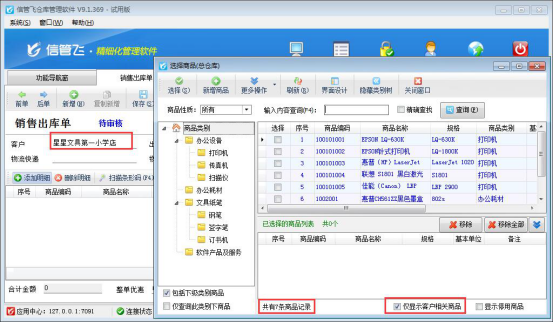信管飛倉庫管理軟件、信管飛RMS軟件等都支持開單時選擇系統(tǒng)已錄入的商品信息,進行快速選擇多個商品開單,在選擇商品的時候默認(rèn)顯示的是所有商品(如圖所示),有部分客戶想在選擇商品窗口僅顯示出此客戶的相關(guān)產(chǎn)品,本文我們以“信管飛倉庫管理軟件”為例示范下如何在選擇商品窗口僅顯示客戶相關(guān)商品。 在功能導(dǎo)航窗點擊