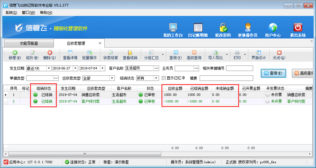 客戶預(yù)付款是客戶提前預(yù)付給我們的金額,可以用來沖銷銷售產(chǎn)生的應(yīng)收款,本文以信管飛出納記賬軟件專業(yè)版為例演示一下如何使用客戶預(yù)付款沖銷銷售應(yīng)收款? 在功能導(dǎo)航窗點擊“往來管理”—》“應(yīng)收款管理”打開應(yīng)收款管理界面,如下圖所示,在應(yīng)收款管理內(nèi)對同一個客戶分別新增一條應(yīng)收款記錄,一條預(yù)付款記錄,結(jié)銷狀態(tài)為“未結(jié)銷”狀態(tài),