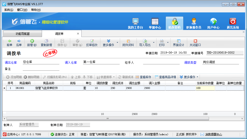 信管飛RMS及信管飛倉庫管理軟件都支持調(diào)撥單,調(diào)撥單主要用于庫存商品在各倉庫之間的調(diào)貨。調(diào)撥分為同價調(diào)撥和變價調(diào)撥兩種,其中同價調(diào)撥方式,商品的成本價以調(diào)出倉庫的成本價為準(zhǔn);變價調(diào)撥(或稱“異價調(diào)撥”),商品的成本價可進行修改,一般用于分?jǐn)傔\費/裝卸費等運輸費用。總部到門店的調(diào)撥一般采用變價調(diào)撥。 在功能導(dǎo)航窗點“倉庫管理”