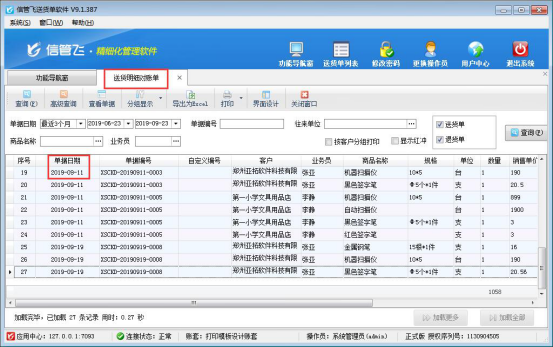 信管飛送貨單軟件支持開送貨單以及支持對已開單據(jù)明細匯總在送貨明細對賬單重,方便對賬。有時候需要把明細對賬單導出發(fā)給對應的客戶進行對賬。軟件送貨明細對賬單默認日期格式是顯示時間的,為了導出Excel文件更簡潔明了,軟件可設置送貨明細對賬單表的日期格式不顯示時間,只顯示出單據(jù)日期。 功能導航窗選擇“業(yè)務處