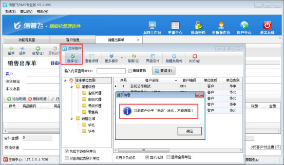 信管飛RMS軟件是集采購管理、銷售管理、庫存管理、往來賬管理等為一體的進銷存管理軟件。經(jīng)常會有用戶問到刪除客戶資料時會彈出提示信息:“當前選擇的往來單位在單據(jù)中有使用,不能刪除”(如下圖一所示),刪除不了,為什么? 系統(tǒng)默認在單據(jù)中已使用過的往來單位信息是不能刪除的,因為如果刪除,則會影響之前已使用此往來單位信息