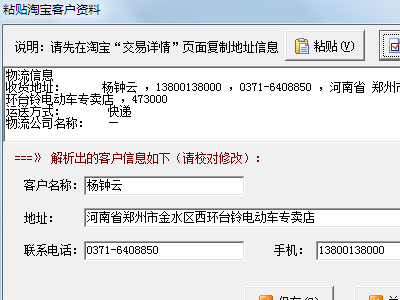 紅管家送貨單軟件最新版增加了粘貼淘寶客戶資料功能,但由于用戶手冊更新不及時,很多用戶不知道如何使用這個功能,下面我們介紹下如何從淘寶粘貼客戶資料。 首先,打開淘寶訂單詳情頁,然后在“收貨和物流信息”中復制“圖示部分”的內容: 然后,在送貨單或訂單開單窗口,點“更多操作”->