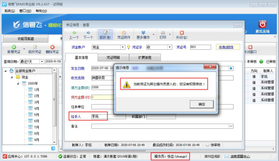 信管飛RMS軟件標準版和專業版、信管飛出納記賬軟件標準版和專業版都包括出納管理模塊,都可以錄入現金日記賬與銀行日記賬憑證。軟件默認操作員可以修改其他人員所開的出納憑證,如果您不想讓操作員修改其他人員所開的出納憑證,可以在軟件中進行設置。下面我們以信管飛RMS軟件專業版為例介紹一下在軟件中如何設置“操作員不可修改其他人員所開的出納憑證”。