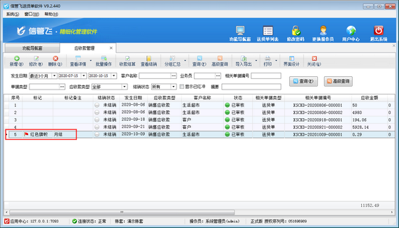 信管飛送貨單軟件支持管理客戶的應(yīng)收款信息,可對應(yīng)收款信息標(biāo)記備注內(nèi)容,本文演示一下具體操作步驟。 軟件登錄后,點擊“業(yè)務(wù)處理”—》“應(yīng)收款管理”可以打開應(yīng)收款管理界面,如下圖所示,應(yīng)收款管理界面可以查看客戶的應(yīng)收款信息及詳細結(jié)銷情況,應(yīng)收款記錄一般由送貨單自動生成,其類型為“銷售應(yīng)收款”,或者由退貨單自動生成,其類型為“銷售