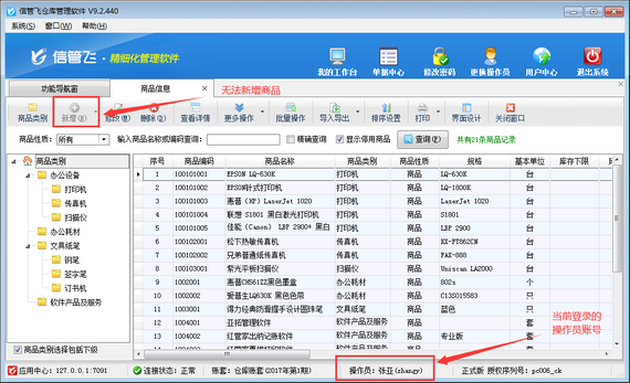 信管飛送貨單軟件、信管飛RMS(進銷存管理軟件)、信管飛倉庫管理軟件等都支持維護商品信息和允許設(shè)置多個操作員登錄軟件,為了避免開單時不同操作員同時新增商品出錯,軟件支持設(shè)置操作員權(quán)限,可以設(shè)置操作員開單時不能直接新增商品信息只能選擇添加好的商品信息。 以信管飛倉庫管理軟件為例,示范下如何設(shè)置操作員不能新增商品信息。