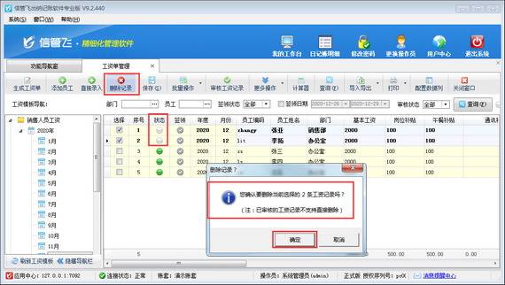 信管飛出納記賬軟件專業版包括工資管理功能,支持自定義工資模板,可根據設置的工資模板快速生成工資單,支持從上月工資單復制工資項目數據,工資記錄審核后,無法直接刪除,如下圖所示,如確定需要刪除,需要反審到未審核狀態,然后在執行刪除操作,本文介紹一下出納記賬軟件中如何刪除已審核的工資記錄? 演示視頻觀看鏈接:出納記賬軟件中如何刪除