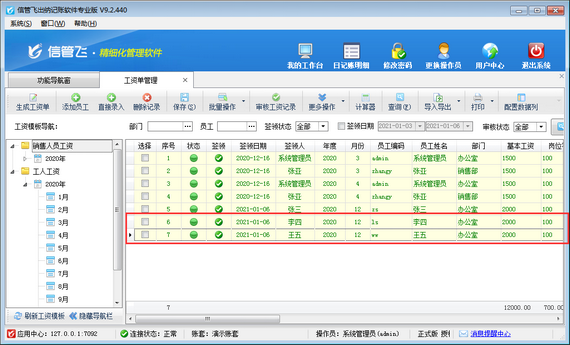 信管飛出納記賬軟件專業(yè)版包括工資管理功能,支持自定義工資模板,可根據(jù)設(shè)置的工資模板快速生成工資單,支持從上月工資單復(fù)制工資項目數(shù)據(jù),工資項目數(shù)據(jù)錄入完成核對無誤后審核生效,審核后不再支持直接修改。如果工資記錄較多,逐條審核工資記錄會比較耗時,軟件支持批量審核工資記錄,可節(jié)省時間提高工作效率。本篇文章介紹一下出納記賬軟件中如何批量審核工資記錄? &nb
