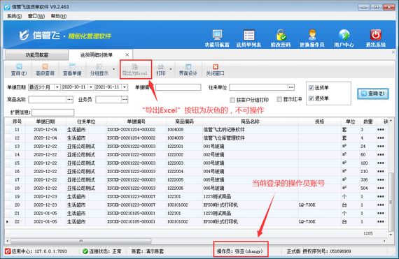 信管飛送貨單軟件為集訂單管理、送貨管理、收款結(jié)算等功能并支持送貨明細(xì)對賬及業(yè)務(wù)綜合對賬的送貨單打印軟件。軟件根據(jù)錄入的每張訂單及送貨單等數(shù)據(jù),可以自動生成統(tǒng)計報表,完成企業(yè)銷售統(tǒng)計查詢和與客戶送貨明細(xì)對賬的目的,如下圖所示。如果不希望操作員賬號登錄后導(dǎo)出送貨明細(xì)對賬單,如何設(shè)置呢?本篇文章介紹一下具體操作步驟。 演示視頻觀看