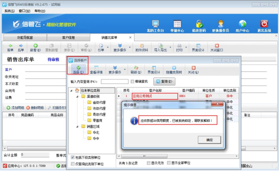 信管飛RMS軟件包含應收應付款功能,可對客戶和供應商設置應收應付信用額,客戶在信用額度內可先收貨后付款,對于超過信用額度的客戶,軟件支持在基礎資料—“客戶信息”中設置鎖定功能,不允許繼續開單,付款后可進行解鎖。本文以“信管飛RMS標準版為例”,示范下如何鎖定超出信用額度的客戶。超出信用額度的客戶“亞拓公司測試”在未設置鎖定前,開銷售出庫單審核單據會提示“當前往來單位將會超出應收信用額度,是否繼續”