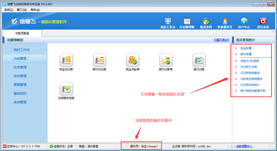 信管飛出納記賬軟件內(nèi)包含豐富的記賬統(tǒng)計報表,如現(xiàn)金賬簿、銀行賬簿、資金日(月)報表、收支類別匯總表等。如果不希望員工賬號登錄后查看到這些報表,如何設(shè)置呢?本篇文章以信管飛出納記賬軟件專業(yè)版為例演示一下出納記賬軟件內(nèi)如何設(shè)置操作員不可查看收支類別匯總表? 登錄軟件,在功能導(dǎo)航窗點(diǎn)擊“系統(tǒng)管理”—》“操作員及授權(quán)”,進(jìn)入“操作員